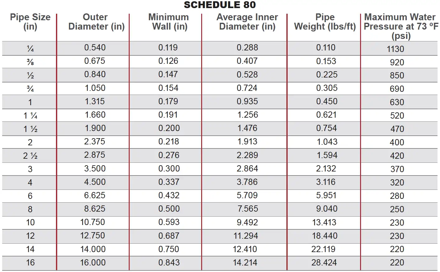 Important: “Schedule 80” for thermoplastic is a common commercial designation with manufacturer-published pressure ratings; do not assume the same temperature/pressure performance as metallic schedule 80 without checking manufacturer data.